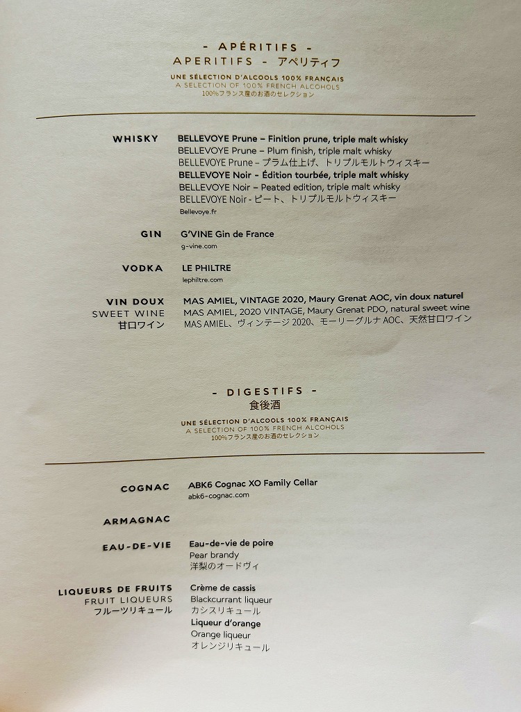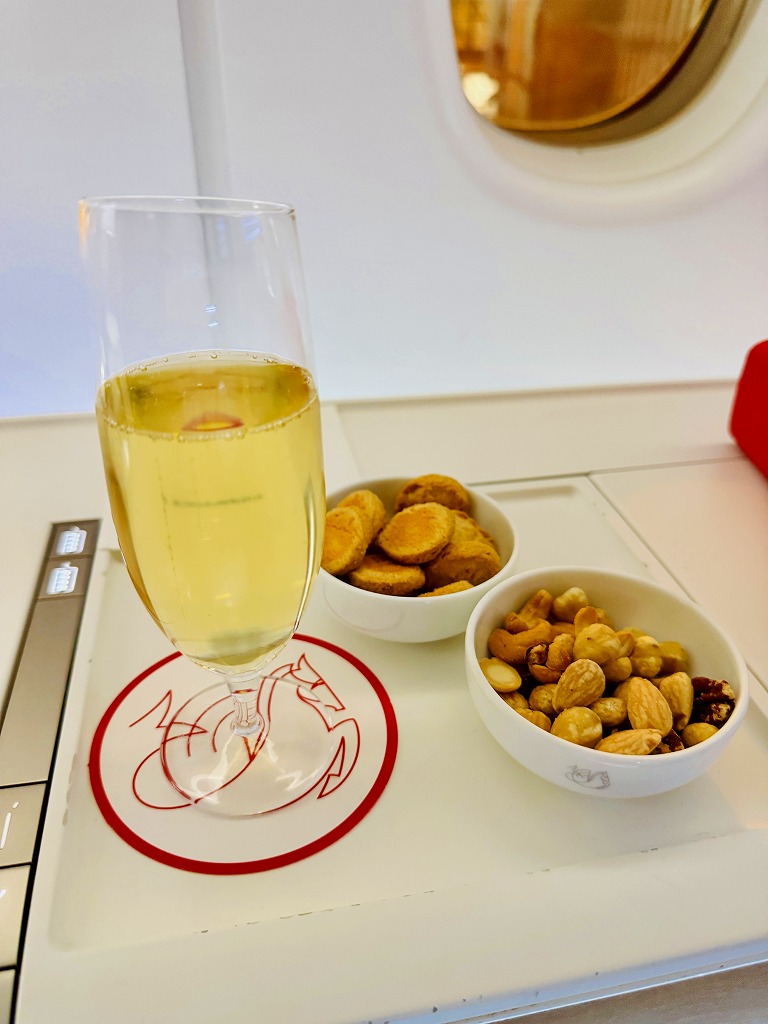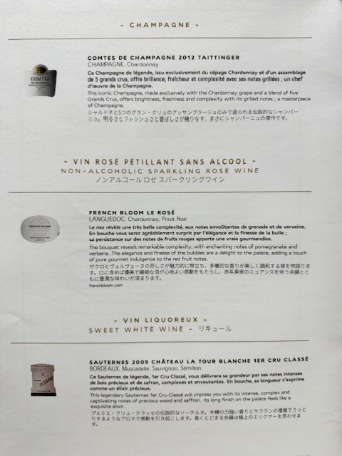 この流れは、地上の前回記事にした「ラプルミエール ラウンジ」でも同様で、どのお酒も必ず味を確かめてから選べるのが印象的です!他社のファーストクラスではあまり経験したことがなく、いろいろ試しながら選べるのがとても楽しく、嬉しい時間でした。