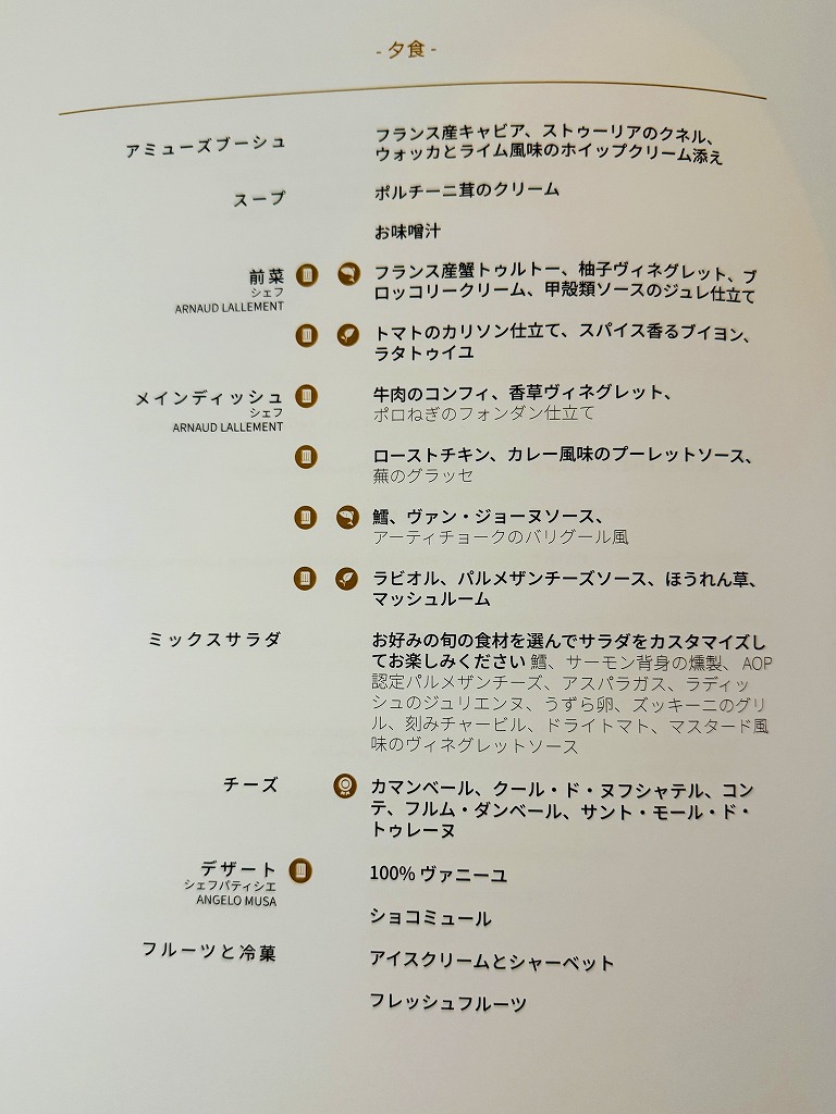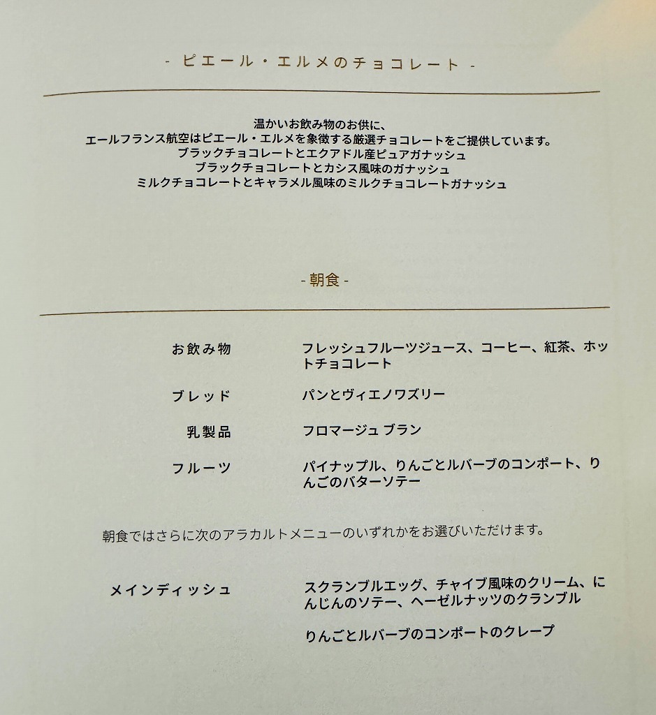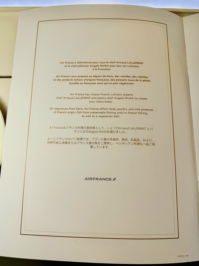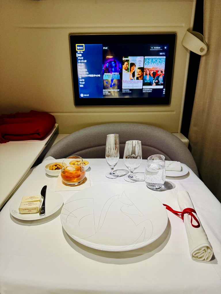 ファーストクラスの担当は全てフランス人の男性の方(みなさん、身長体格ともに大きな男性のベテランフライトアテンダントさんでした!)だったので、この日のビジネスクラスを担当されていた日本人のフライトアテンダントさんもわざわざ挨拶に来て対応してくれました。こちらの日本人のフライトアテンダントさんもまた大変親切で、フライト中に何度もビジネスクラスからファーストクラスへとやってきてくれました(*^^*)