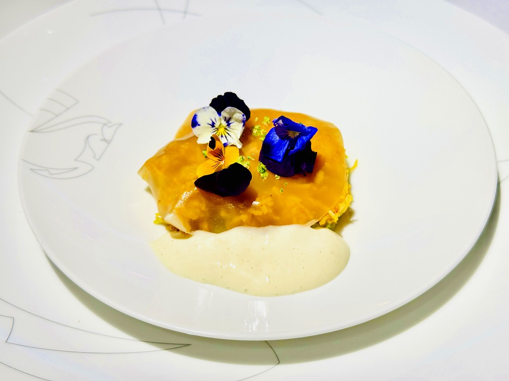 甲殻類ソースのジュレの膜の中を破くと、中からはフランス西岸で水揚げされるトゥルトー(ヨーロッパイチョウガニ)とブロッコリーソースが出てきます。