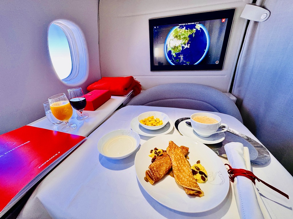 【エールフランス航空ビジネスクラス】搭乗記(*^▽^*)!東京ーパリ!座席、フランスらしい機内食、昼食と朝食、アメニティ、ギャレーのスナックも紹介!B777、JALマイルの特典航空券で搭乗!